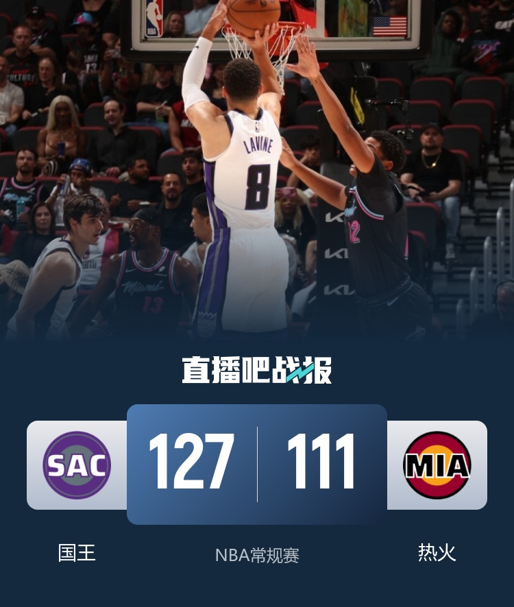 首节开打后两队迅速进入状态,拉文连投带罚单节狂揽18分,热火内外结合及时回应,首节结束时国王领先3分,次节回来,拉文火力不减单节再中3记三分,国王中段一波10-0拉开比分,半场战罢,国王确立17分优势。短暂休整后热火进攻依然滞涩,零敲碎打难以打出追分高潮,拉文无人可挡继续砍分,三节结束后国王将分差扩大到23分,末节上来,热火没有放弃继续追分,替补众将轮番发威,国王顶住对手反扑,最终127-111大胜热火终结4连败。