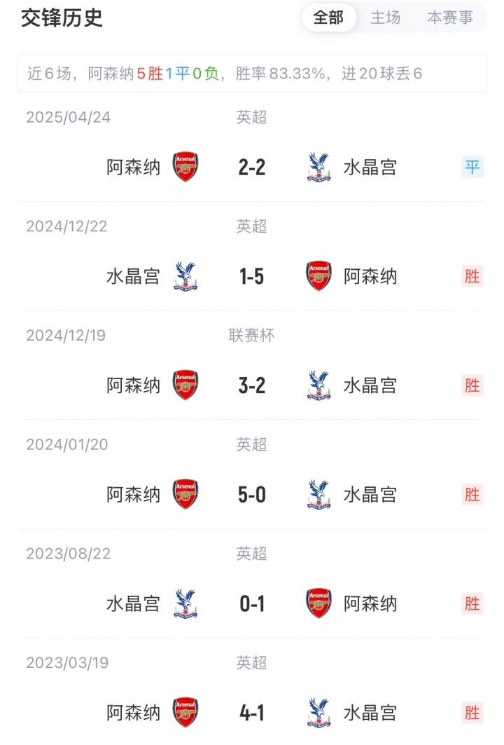 目前,阿森纳6胜1平1负积19分位列英超第1,他们各项赛事9轮不败;水晶宫3胜4平1负积13分位列英超第9,近期他们各项赛事遭遇3轮不胜。