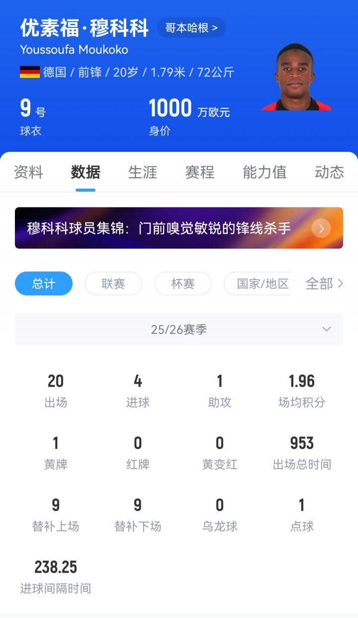 按照官方信息,穆科科下个月就将年满21岁,他目前的德转身价为1000万欧。