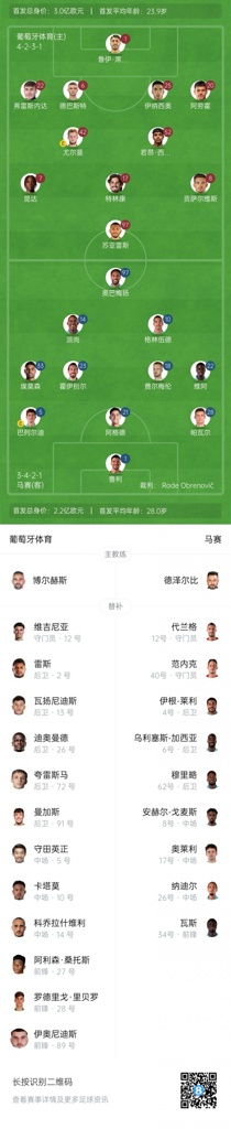 葡萄牙体育首发:1-鲁伊·席尔瓦、22-弗雷斯内达、6-德巴斯特、25-伊纳西奥、20-阿劳霍、42-尤尔曼、52-若昂·西蒙斯、7-昆达、17-特林康、8-贡萨尔维斯、97-苏亚雷斯